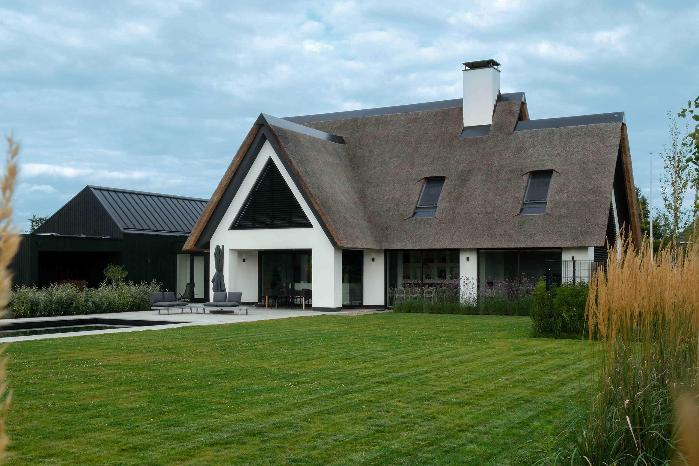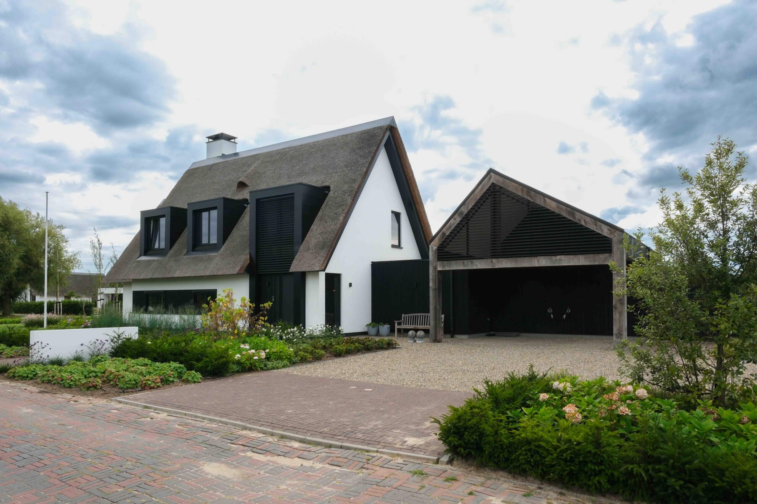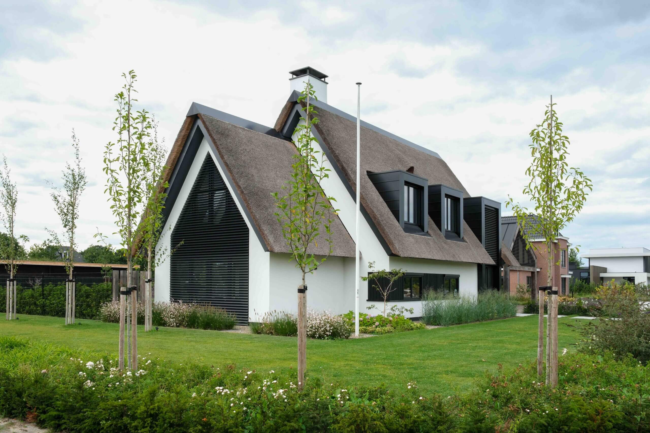 Wij hebben het architectonische ontwerp mogen verzorgen van deze prachtige moderne villa. Kenmerkend voor dit ontwerp is de rieten kap in combinatie met de witte gevel, de donkere lamellen en de grote glasoppervlakten. Door de vele raampartijen aan de achterzijde van de woning zijn de keuken en woonkamer goed verlicht. Daarnaast kijken de bewoners prachtig uit over de tuin.
