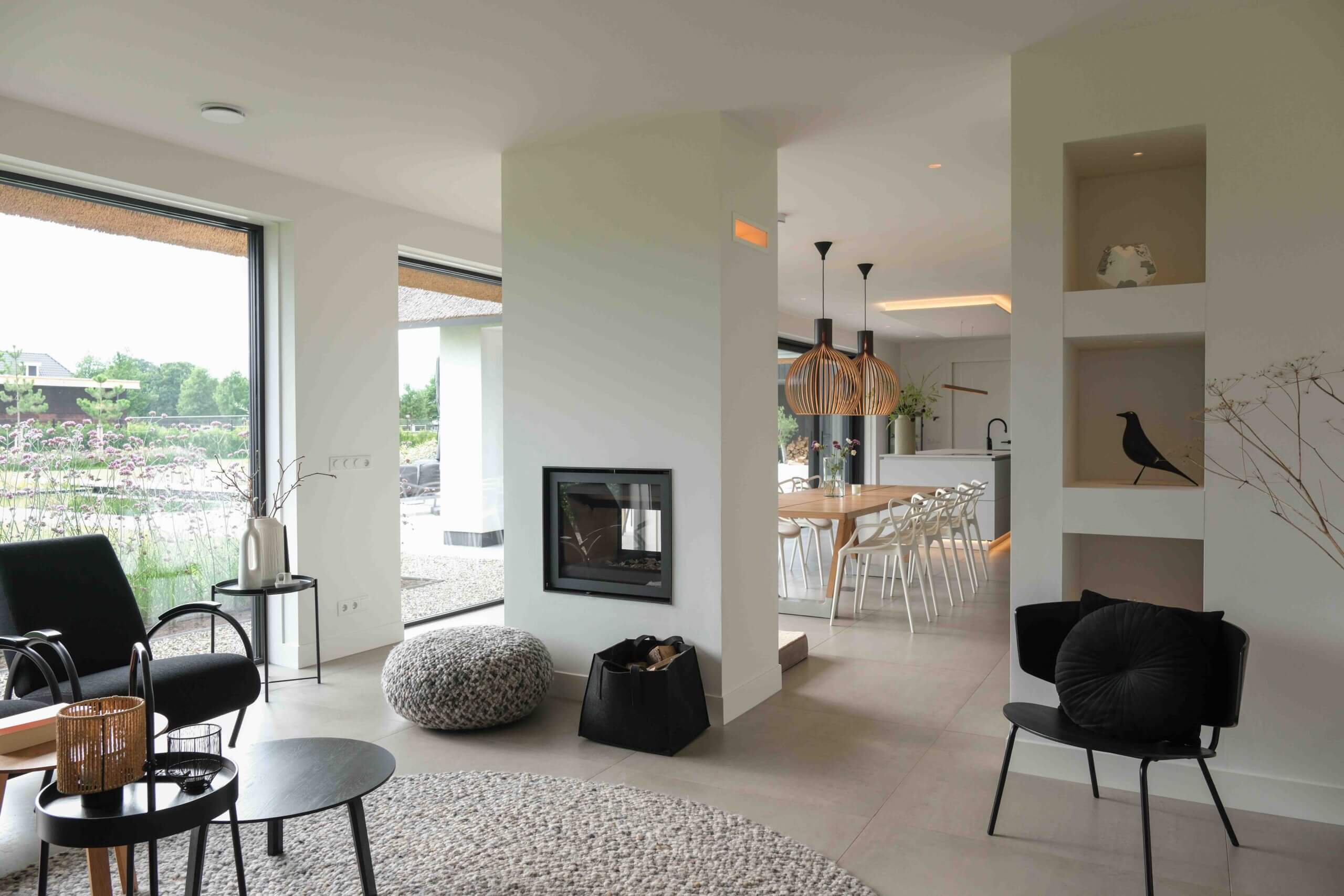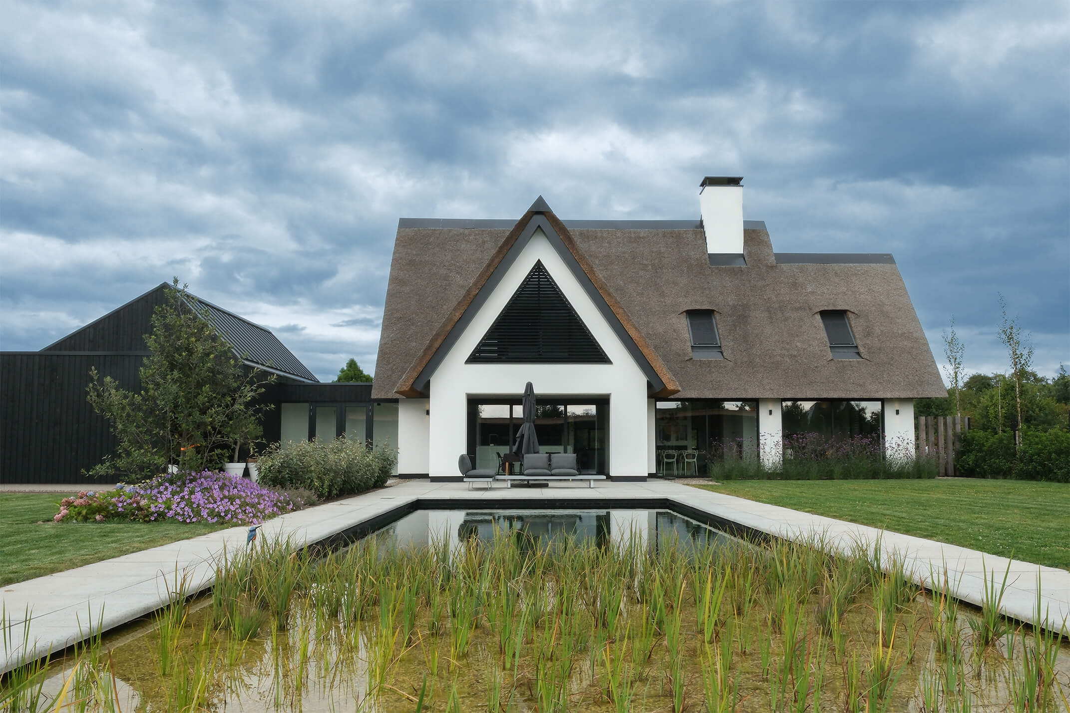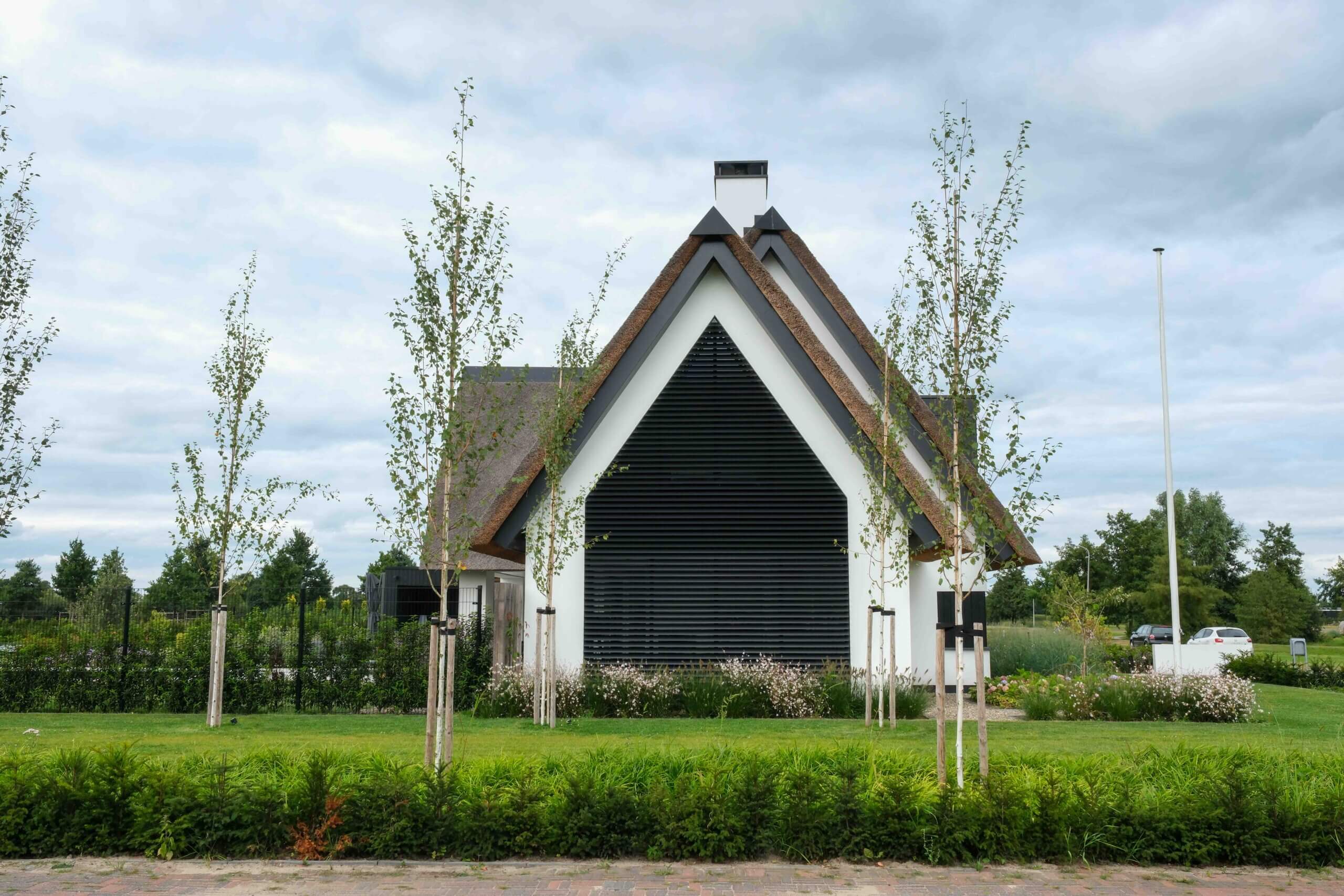 Wij hebben het architectonische ontwerp mogen verzorgen van deze prachtige moderne villa. Kenmerkend voor dit ontwerp is de rieten kap in combinatie met de witte gevel, de donkere lamellen en de grote glasoppervlakten. Door de vele raampartijen aan de achterzijde van de woning zijn de keuken en woonkamer goed verlicht. Daarnaast kijken de bewoners prachtig uit over de tuin.