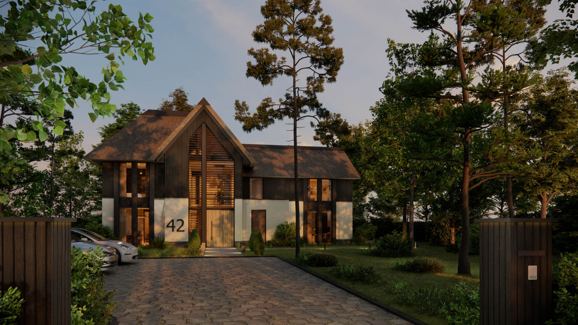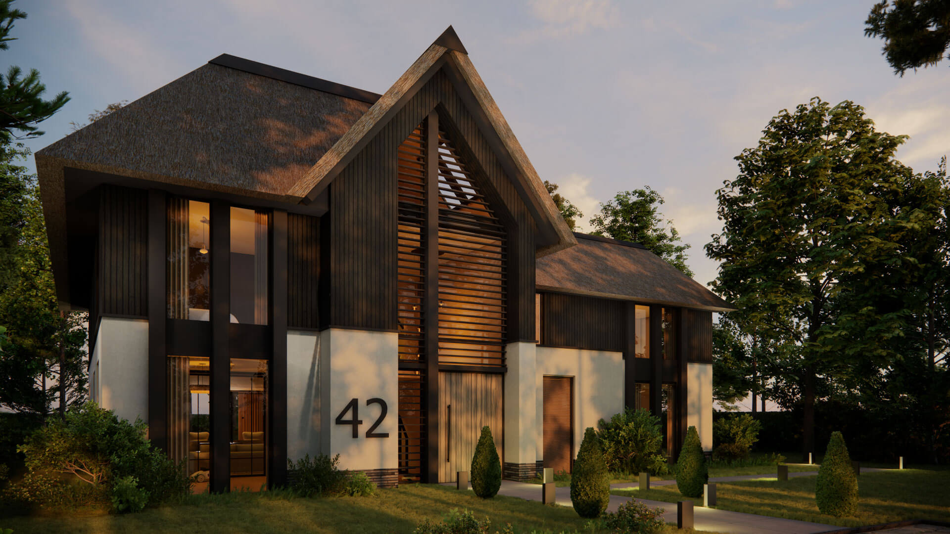 In een prachtige omgeving in Gelderland wordt een jaren '50 woning verbouwd tot moderne villa. Met stucwerk, langgerekte stenen en verticaal donker hout krijgt het een compleet nieuwe uitstraling. De strakke rieten kap maakt het helemaal af.